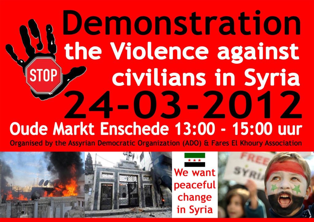 De Assyrische Democratische Organisatie (ADO) houdt samen met de Fares El Khoury Vereniging (red: Fares El Koury was de eerste en enige christelijke premier die Syrië ooit heeft gehad) een demonstratie tegen het aanhoudende geweld in Syrië. De demonstratie zal van 13.00 tot 15.00 uur plaatsvinden op de Oude Markt in Enschede.